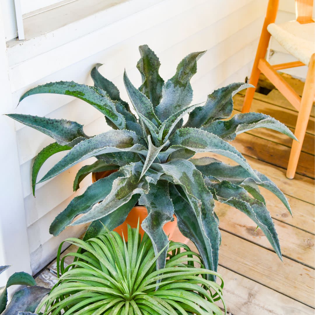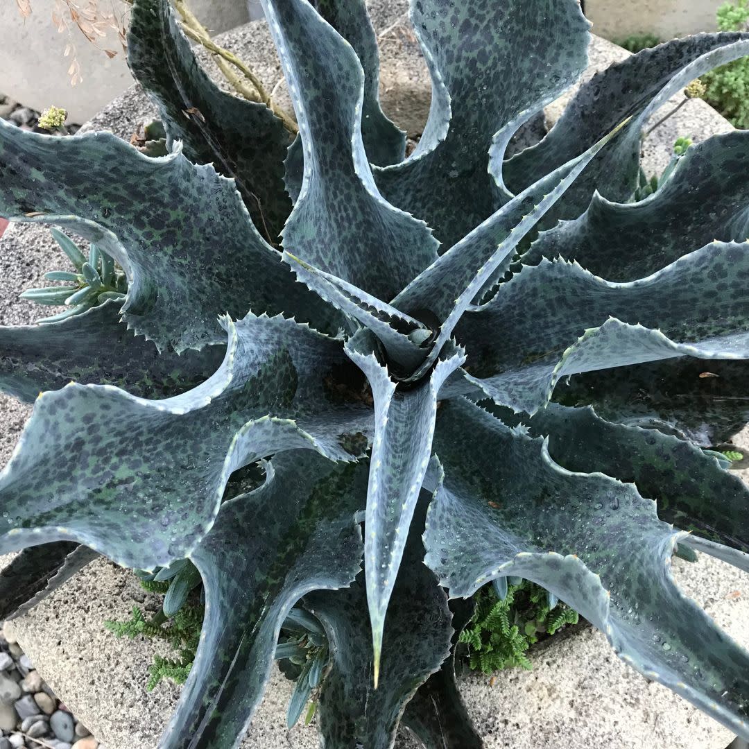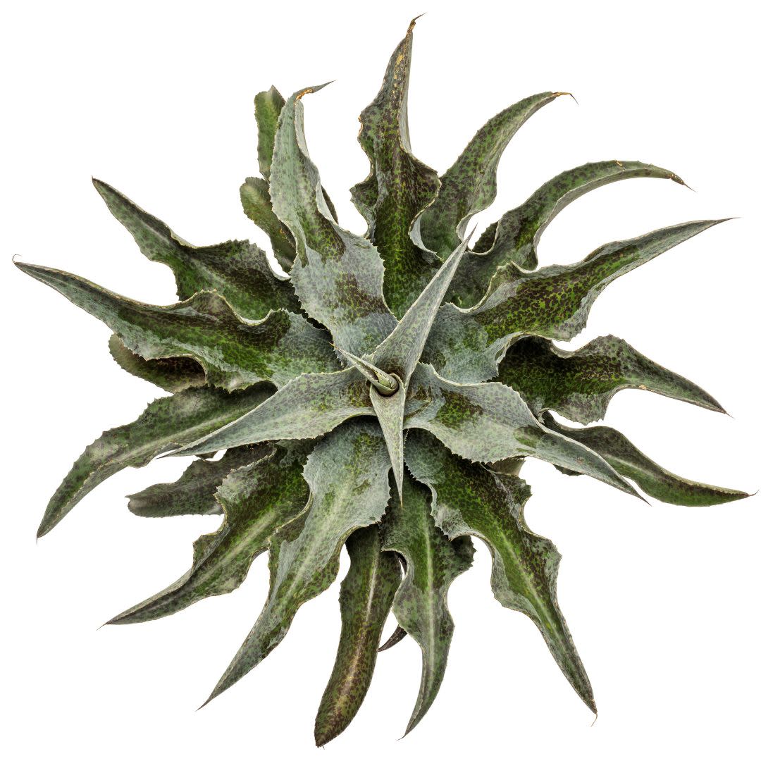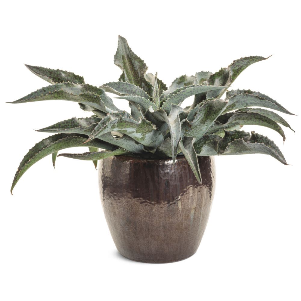 The Art & Sol™ 'Catch a Wave' Mangave hybrid is a stunning succulent that brings both texture and elegance to any space. Its thick, silvery blue-green leaves are beautifully marked with subtle dark spots, creating a striking contrast against the cool-toned foliage. The leaf margins curl upward, showcasing distinct marginal teeth that add an extra layer of intrigue. With its upright growth habit, 'Catch a Wave' looks equally captivating from a side view as it does from above, making it a versatile and eye-catching addition to your plant collection.