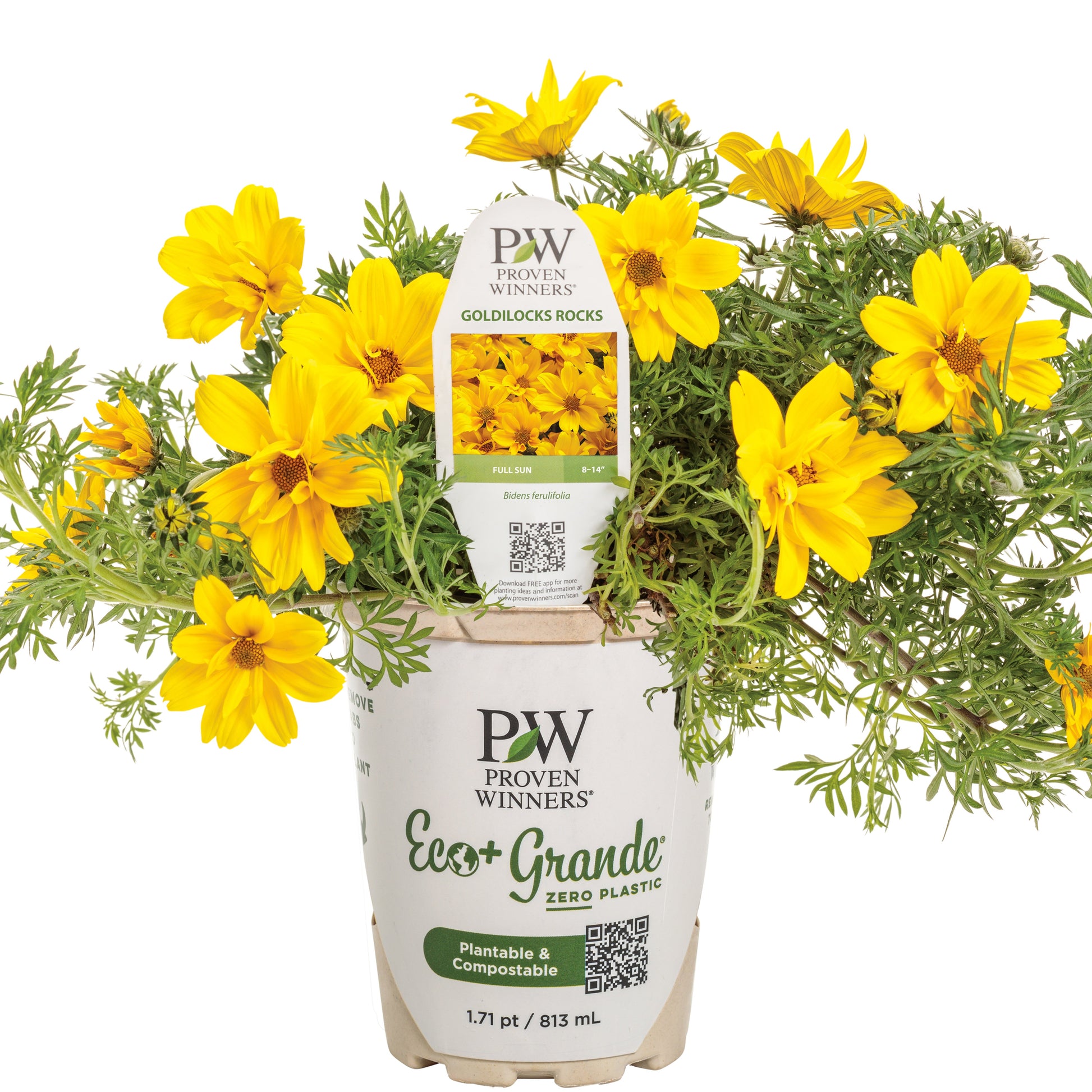 Add a burst of sunshine to your garden with Goldilocks Rocks®, the most vibrant and vigorous bidens you'll ever grow. This stunning variety showcases bright gold flowers that bloom profusely all season long, creating a radiant display of color. Each flower reaches an impressive 3" in diameter, making it the largest-flowered bidens we've ever seen.