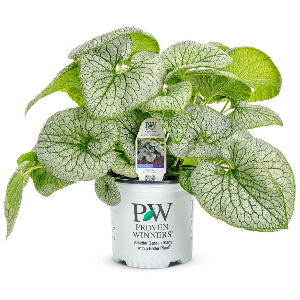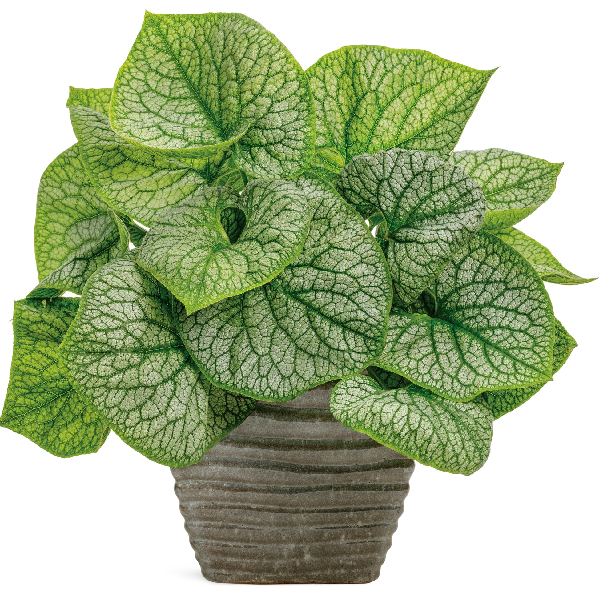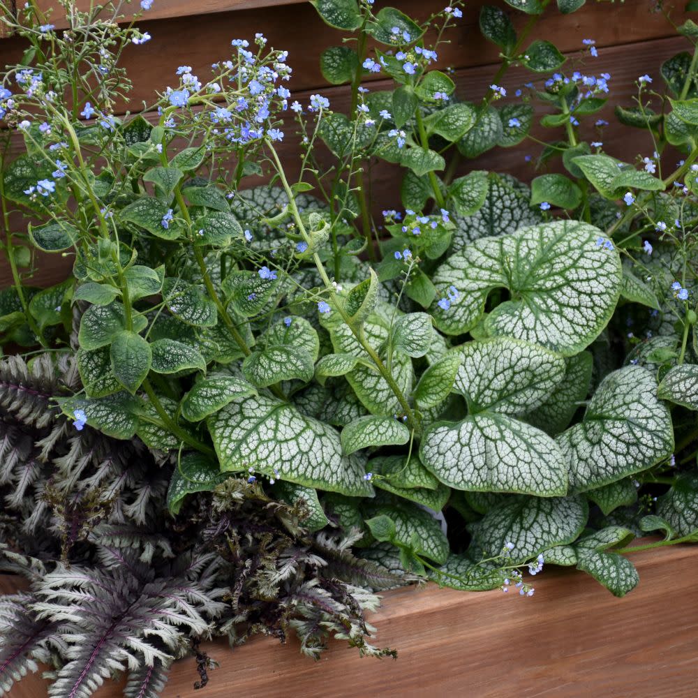 Introducing 'Jack of Diamonds,' a showstopper that adds striking beauty to any garden or container! With 9-10" leaves featuring a silver overlay and dark green veining, this plant’s dramatic, overlapping foliage forms circular shapes from afar, creating a stunning visual effect. In mid to late spring, delicate baby blue blossoms—reminiscent of forget-me-nots—emerge, adding a soft touch of color. The mounded habit makes 'Jack of Diamonds' a perfect filler and spiller for containers, while also thriving in the landscape. It’s a true gem that combines beauty, texture, and versatility!
