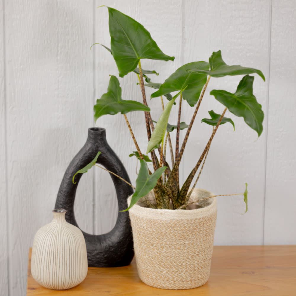 Discover the tropical allure of Mythic ‘Jungle Music,’ a stunning Alocasia that harmonizes style with nature. Its medium green, arrowhead-shaped leaves gracefully rise from striking zebra-striped petioles, creating a lively rhythm reminiscent of the rainforest. This compact version of Alocasia zebrina features smaller leaves and shorter stems, making it the ultimate addition to any space.