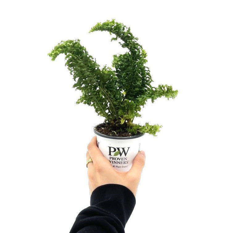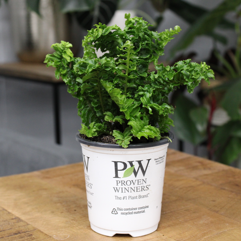 The Twirly Whirly™ Fern is a dwarf variety of the common Boston fern and goes by many names including button sword fern, erect sword fern, little-leaved sword fern, and fishbone fern. This adorably compact fern is known for being resilient and less finicky than some of its relatives, and its small size makes it perfect for growing indoors. The deep, emerald green foliage has a crinkled texture with a more upright growth pattern than other ferns.