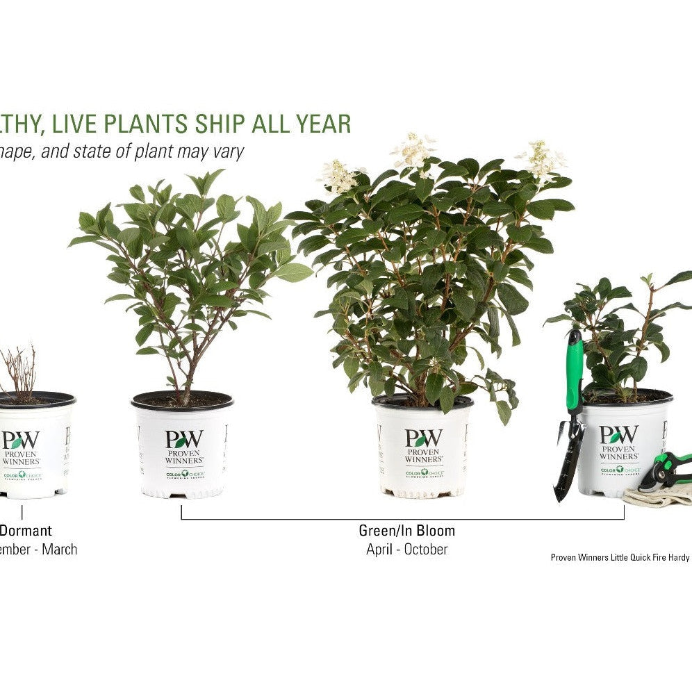 - Shrubs shipped Nov-Apr will arrive dormant; shrubs shipped Apr-Oct will arrive green or in bloom