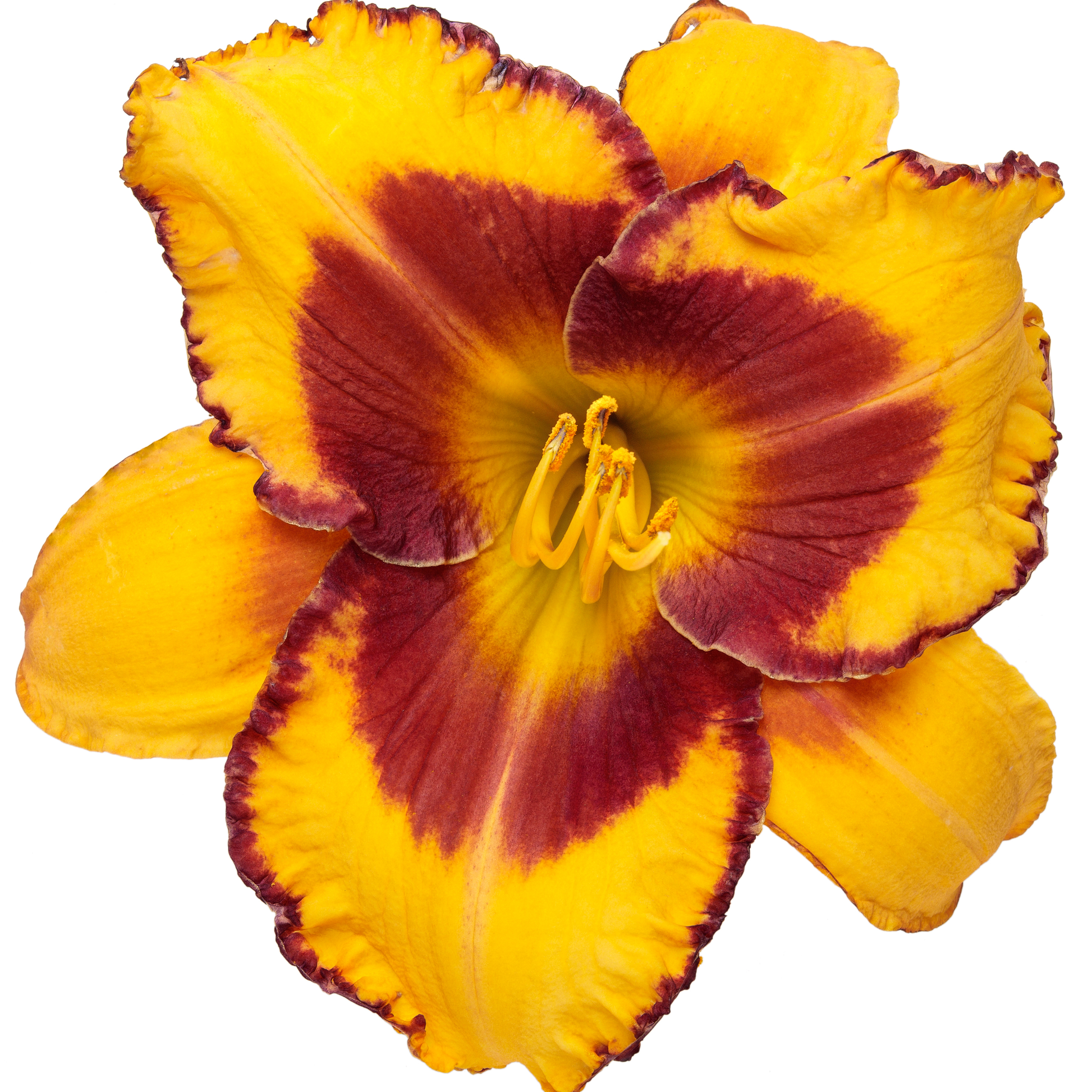 Rainbow Rhythm® 'Blazing Glory' Daylily has big, 6-inch flowers and big color presentation to match. Atop strong green foliage you'll find a rippled yellow flower with a triangular burgundy center and burgundy lining along the edges. Unlike traditional cultivars, this detailed pattern of color won't bleed or fade. It holds onto blooms well and is quite hardy. 'Blazing Glory' is a fantastic choice for any gardener interested in attracting all types of pollinators, and keeping the rabbits away!