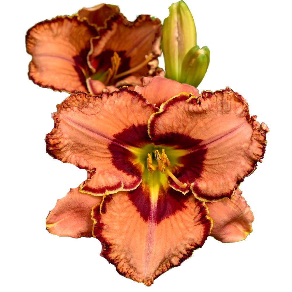 'Fearfully and Wonderfully Made' Daylily is a captivating mid-sized beauty that stands out in any garden. Its 5½" blooms seem even larger than their measured size, thanks to the wide petals with delicate piecrust edges. The coral pink flowers, accented with rich cranberry red eyes, create a striking contrast. The cranberry red continues to the margins, where a soft yellow trim adds a touch of brightness and charm. With well-branched scapes and an abundance of buds, this daylily offers impressive rebloom, ensuring a stunning display throughout the season. Perfect for adding both color and texture to your garden, it's a true floral masterpiece.