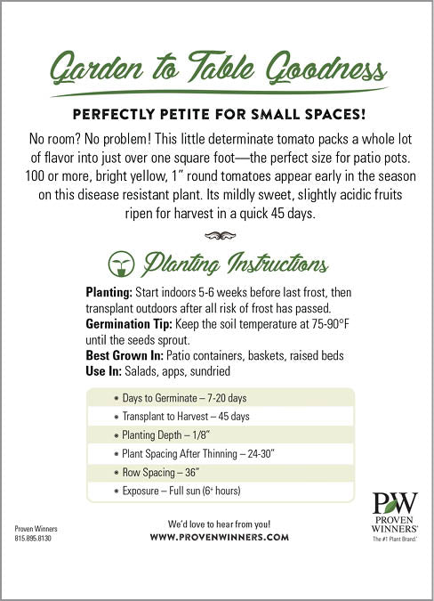 No room? No problem! This perfectly petite tomato is a great option for small spaces. This little determinate tomato packs a whole lot of flavor into just over one square foot—the perfect size for patio pots. 100 or more, bright yellow, 1” round tomatoes appear early in the season on this disease resistant plant. Its mildly sweet, slightly acidic fruits ripen for harvest in a quick 45 days.