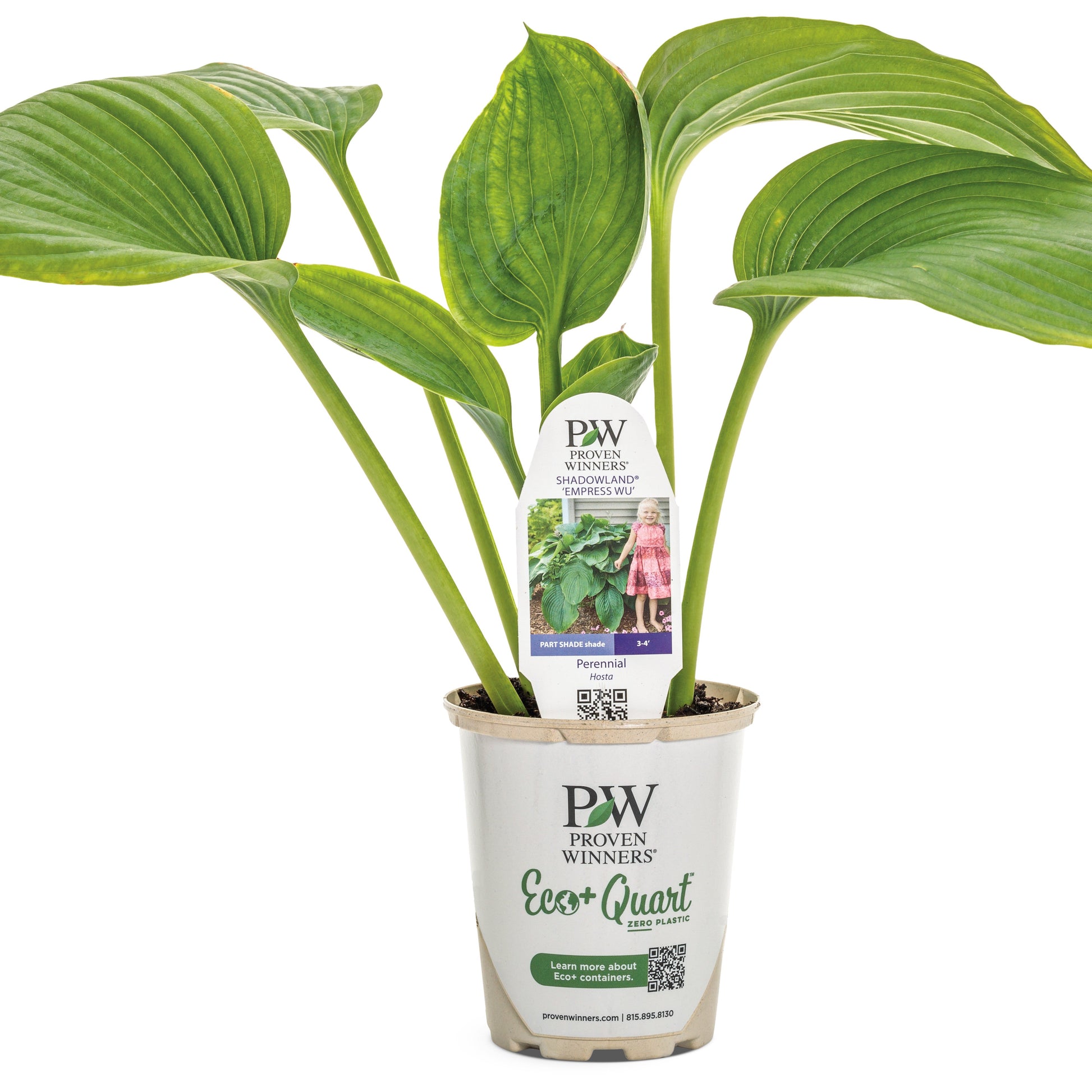 Shadowland® Empress Wu makes a fantastic statement in your shade garden with gigantic upright mounds of thick, dark green leaves topped with pale lavender-purple flowers in early summer. It is the largest known hosta available and provides interesting foliage for containers or landscapes.