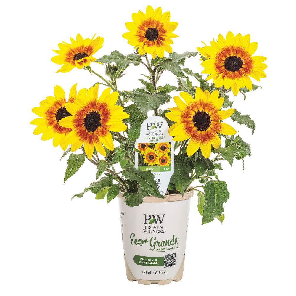 Suncredible® Saturn™ blooms several weeks longer than similar sunflowers due to its semi-indeterminate to determinate habit. It is heat and drought tolerant, attracts pollinators, and resists deer.