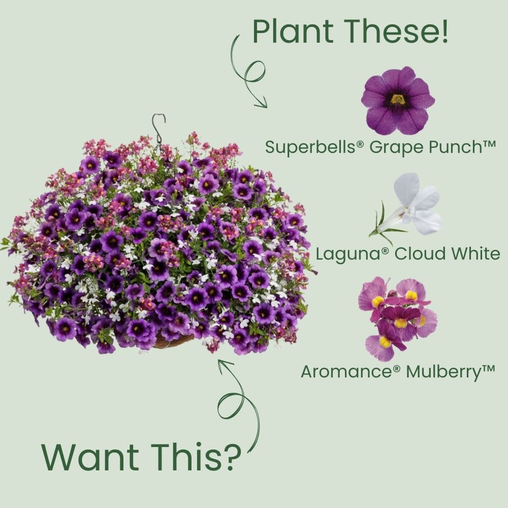 Bring bold color and cascading beauty to your garden with Superbells® Grape Punch! This stunning variety features small, purple, petunia-like flowers with a deep plum center, creating a striking contrast that blooms abundantly all season long. The cascading growth adds a graceful touch to hanging baskets, containers, or garden beds. Heat-tolerant and self-cleaning, Superbells® Grape Punch requires minimal maintenance and doesn’t need deadheading. Its vibrant blooms also attract hummingbirds, adding life and charm to your outdoor space. Perfect for effortless beauty, this variety provides continuous color and hummingbird appeal throughout the season.