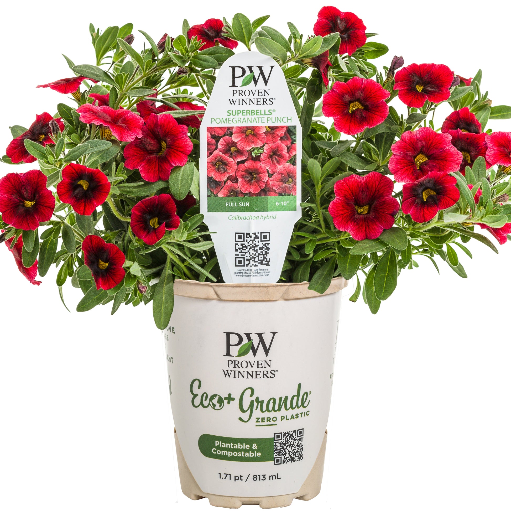 Add dramatic color to your garden with Superbells® Pomegranate Punch! This striking variety features deep velvet red flowers with a bold black center, creating a stunning contrast that blooms abundantly all season long. From planting until the first frost, the small, petunia-like flowers provide continuous color and elegance. Heat-tolerant and low-maintenance, Superbells® Pomegranate Punch requires no deadheading, making it perfect for effortless gardening. Its vibrant blossoms also attract hummingbirds, bringing both beauty and nature’s charm to your outdoor space.