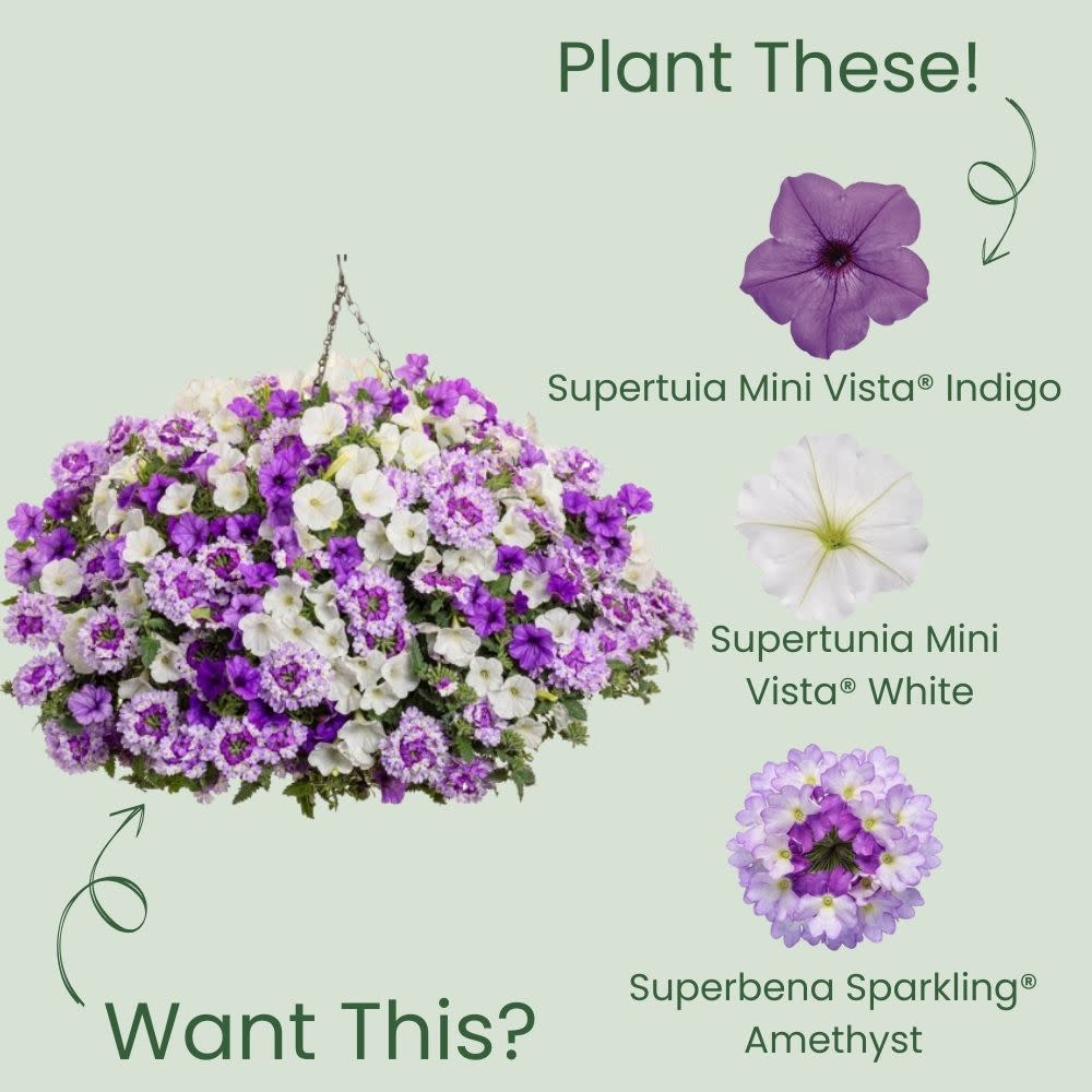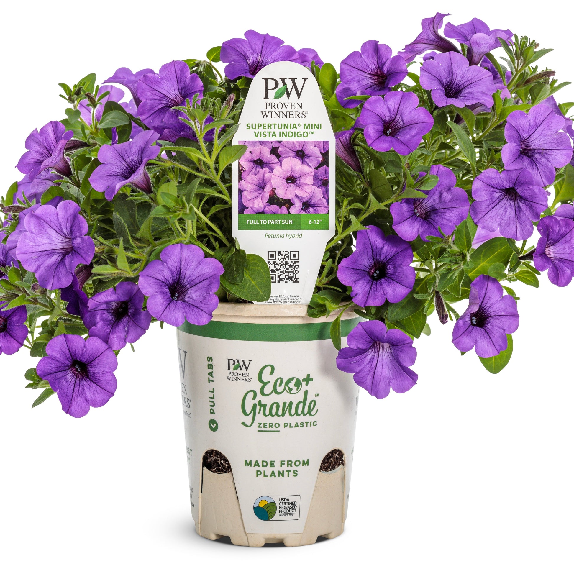 Brighten your garden with Supertunia Mini Vista® Indigo! This charming variety features beautiful blue-purple flowers that bloom abundantly throughout the season. With the same stunning appearance as the Supertunia Vista series but with a slightly more compact growth, these petunias are perfect for smaller spaces. Their mounded habit makes them versatile as both fillers and spillers in containers, while they also excel as landscape plants, especially near the front of flower beds. Heat and drought tolerant, Supertunia Mini Vista Indigo thrives in challenging conditions, attracts pollinators, and requires no deadheading. Bring vibrant color and easy care to your garden with these delightful petunias!
