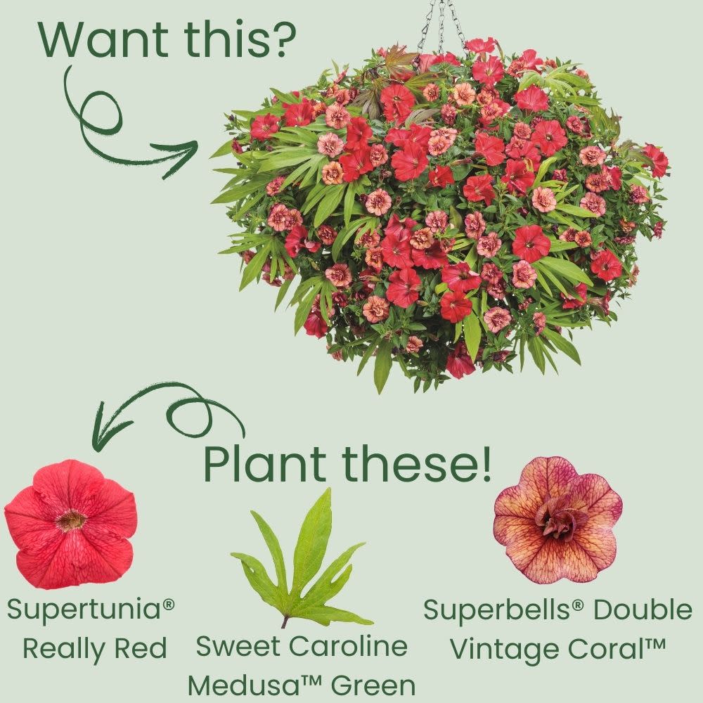 Supertunia® Really Red is striking and features uniform, true red flowers that bloom profusely all season long, creating a vibrant and bold statement in any garden. Known for their vigorous growth and slightly mounded habits, Supertunia petunias are perfect as both fillers and spillers in containers, providing lush, cascading beauty. They also make excellent landscape plants, especially when placed near the front of beds, where their vivid color can truly shine. This award-winning variety is heat and drought-tolerant, attracts pollinators, and requires no deadheading, making it a low-maintenance yet stunning addition to your outdoor space.