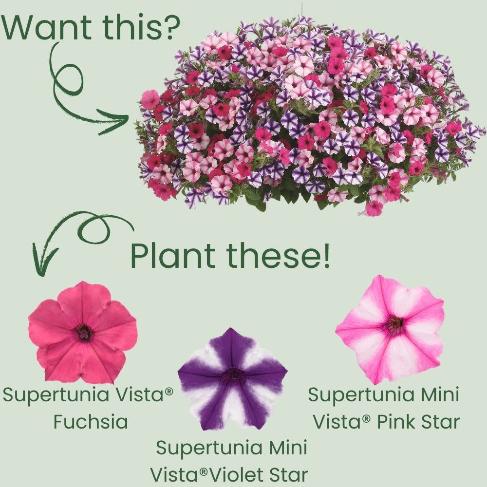 Supertunia Vista® Fuchsia is a bold beauty with vibrant, medium-sized fuchsia pink flowers that bloom all season long. Known for their vigorous growth, Supertunia Vistas are fantastic landscape plants, adding a burst of color to large containers where they act as both fillers and spillers. In garden beds, they work wonderfully in the front or middle, creating a striking focal point. Heat and drought-tolerant, this lively annual also attracts butterflies and hummingbirds, making it a perfect choice for adding charm and life to your outdoor space. A true showstopper that thrives with minimal care!