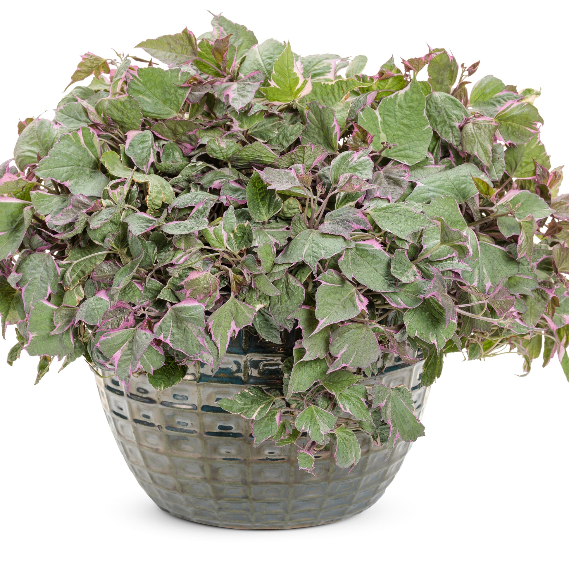 Tricolor Sweet Potato Vine features vibrant, multicolored foliage in shades of green, pink, and white, creating a striking display throughout the season. This vigorous plant makes an excellent spiller in containers and a beautiful ground cover in the landscape, quickly adding texture and color to any space. While its fast growth can sometimes overwhelm less vigorous plants, it’s easy to manage—simply cut back or remove stems as needed to maintain balance. Perfect for adding bold, lively foliage to your garden, Tricolor Sweet Potato Vine thrives with minimal effort, making it a great addition to both decorative pots and garden beds.