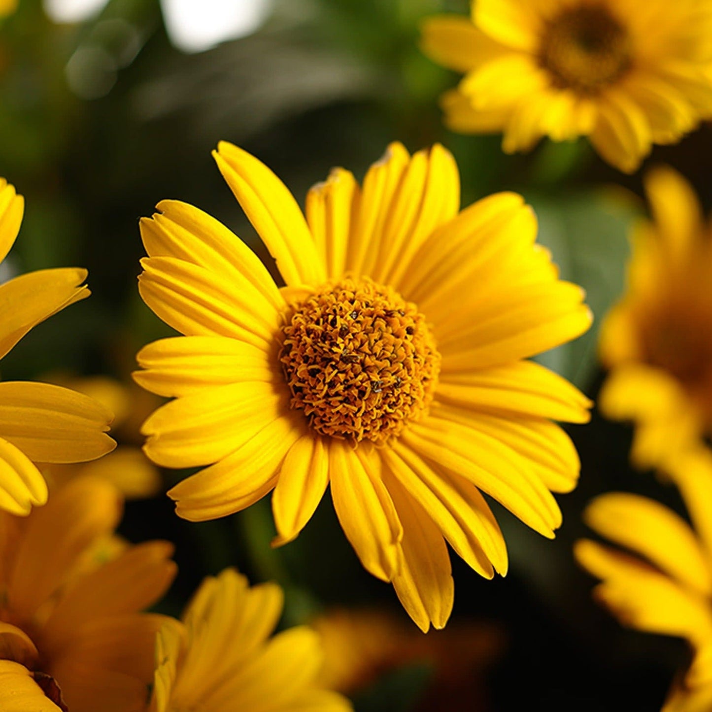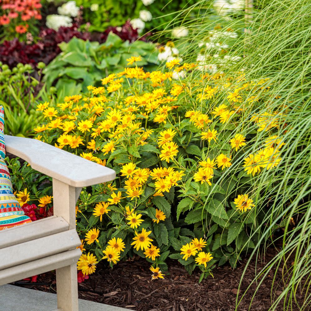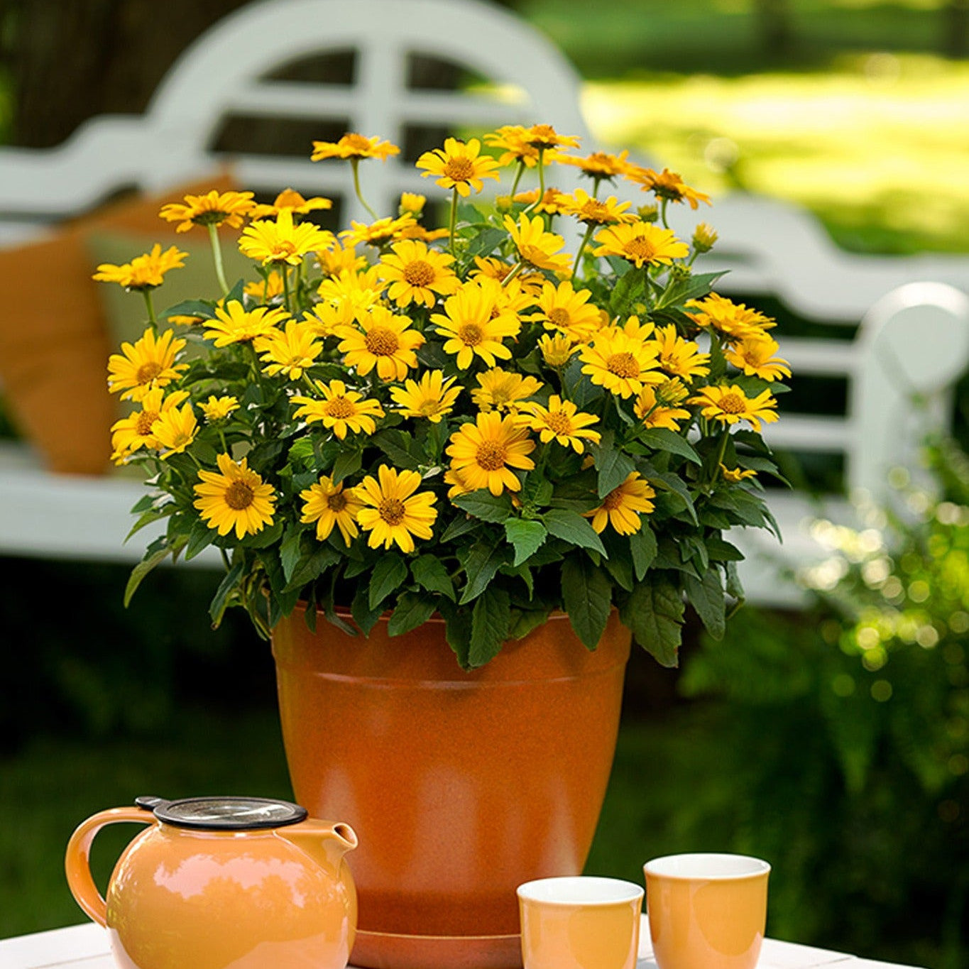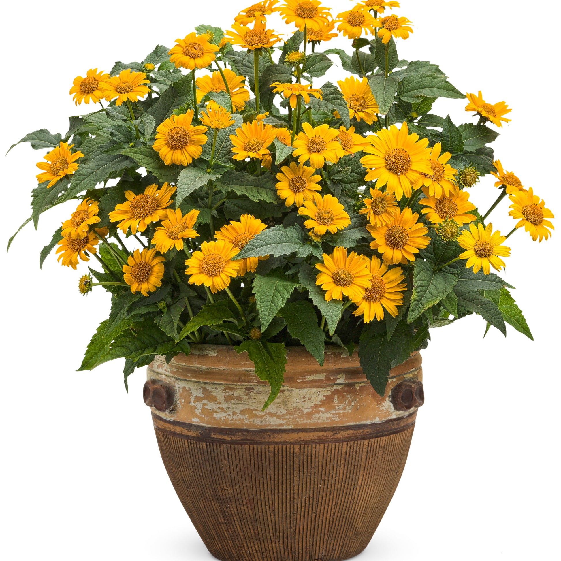 Brighten up your garden with 'Tuscan Sun', the most compact Heliopsis variety available. This award-winning perennial boasts an abundance of brilliant yellow flowers that will light up any landscape. With its more controlled growth habit, 'Tuscan Sun' is perfect for smaller spaces, garden borders, or containers, providing lasting color and charm without overpowering your garden. Enjoy its long blooming season as 'Tuscan Sun' thrives in heat, attracting bees and butterflies, making it a valuable addition to pollinator-friendly gardens. Native to North America, this hardy plant is designed to withstand summer heat while continuing to bloom profusely from early summer through fall.